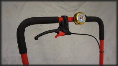 Der Bremsgriff hat 2 Funktionen: 1. Man kann während der Fahrt abbremsen,2. Sie dient als Standbremse, durch umlegen des roten Hebels wird die Bremse arretiert und der Wagen kann nicht wegrollen.Die Bremse hat eine auflaufende Wirkung, das bedeutetdie Bremswirkung ist vorwärts höher wie rückwärts. Mit derGewindehülse am Ende des Bowdenzugs lässt sichdie Bremse nachstellen.