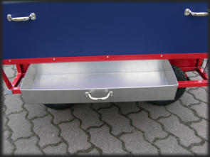 Da man immer etwas mitnehmen muss, haben wir den zur Verfügung stehende Platz optimal ausgenutzt und zweiSchubkästen aus ein 1mm Aluminiumblech gebaut. Diese Schubkästen werden mit zwei Schienen auf dem Gestellbefestigt. Es besteht die Möglichkeit zum Beispiel einen Erste Hilfe Kasten, Spielzeug oder Verpflegung für unterwegsmitzunehmen. Diese Konstruktion ist auch nachrüstbar. Es besteht die Möglichkeit einen oder zwei Schubkästenzu verwenden. Der Schubkasten ist 62 cm lang, 19 cm tief und 8,5 cm hoch.